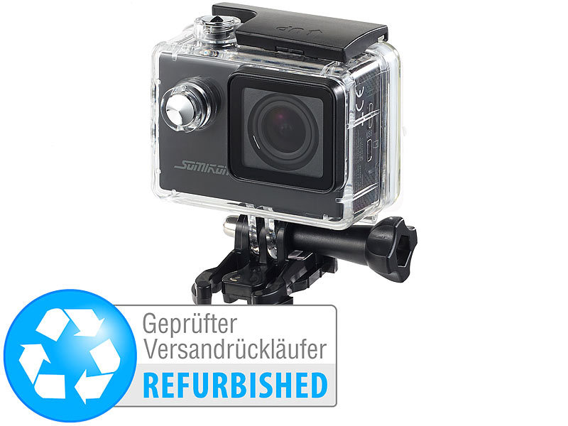 - Action-Cam inklusive Akku, Schutzgehäuse, umfangreichem Montagezubehör, USB-Ladekabel und deutscher Anleitung
